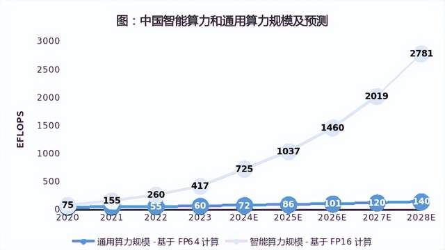 未來80%的場(chǎng)景都將基于人工智能,所占據(jù)的算力資源由智算中心提供[1]。預(yù)測(cè)顯示,2023-2028年,中國通用算力和智能算力的五年年復(fù)合增長(zhǎng)率將分別達(dá)到18.8%、46.2%。