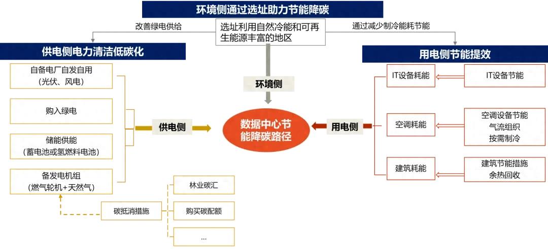 數(shù)據(jù)中心是AI模型運營和硬件部署的核心場景,數(shù)據(jù)中心的綠色低碳將直接決定AI運營碳足跡和AI隱含碳的分?jǐn)傂?。一方面,AI 模型的訓(xùn)練和推理依賴數(shù)據(jù)中心電力,數(shù)據(jù)中心的碳排放(如電力碳強度)直接影響運營碳,另一方面,數(shù)據(jù)中心硬件的隱含碳需通過模型的生命周期分?jǐn)偅魯?shù)據(jù)中心硬件壽命短隱含碳分?jǐn)偛蛔?,會推高單個AI模型的總碳足跡。數(shù)據(jù)中心是AI碳足跡的核心載體,其降碳不僅是環(huán)境要求,更是AI可持續(xù)發(fā)展的必要前提。我國數(shù)據(jù)中心行業(yè)用能90%以上為電能,而70%左右的電力供應(yīng)仍依賴煤電,減碳空間巨大。從轉(zhuǎn)型路徑看,需從用電側(cè)、供電側(cè)與環(huán)境側(cè)三方面協(xié)同發(fā)力,構(gòu)建全鏈條的低碳發(fā)展體系。