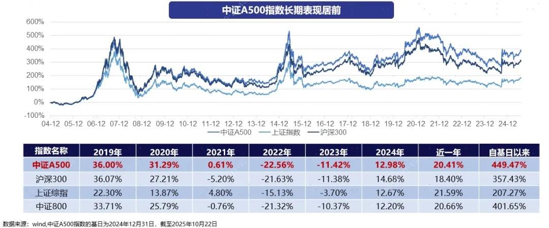 從過往中長期表現(xiàn)來看,自2004年底基日以來至2025年10月22日,中證A500指數(shù)累計(jì)上漲449.47%,顯著跑贏上證指數(shù)和滬深300指數(shù),呈現(xiàn)出“牛市跑贏、熊市跑平”的特征。