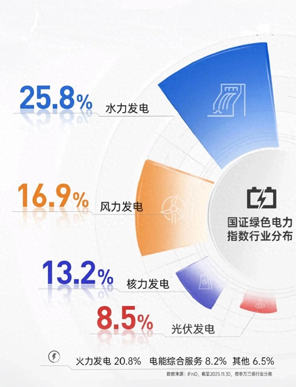 首先,指數(shù)“綠色電力”純度高,權(quán)重股聚焦綠色電力龍頭公司,“綠色”屬性明顯。根據(jù)iFinD,截至2025年12月17日,國證綠色電力指數(shù)行業(yè)分布聚焦清潔能源電力運(yùn)營商,其中公用事業(yè)行業(yè)占比為93.58%,工業(yè)3.08%、信息技術(shù)1.21%、其他2.13%。指數(shù)前十大成分股合計(jì)占比55.83%,且多集中在風(fēng)電、光伏、水電、核電等龍頭企業(yè)。