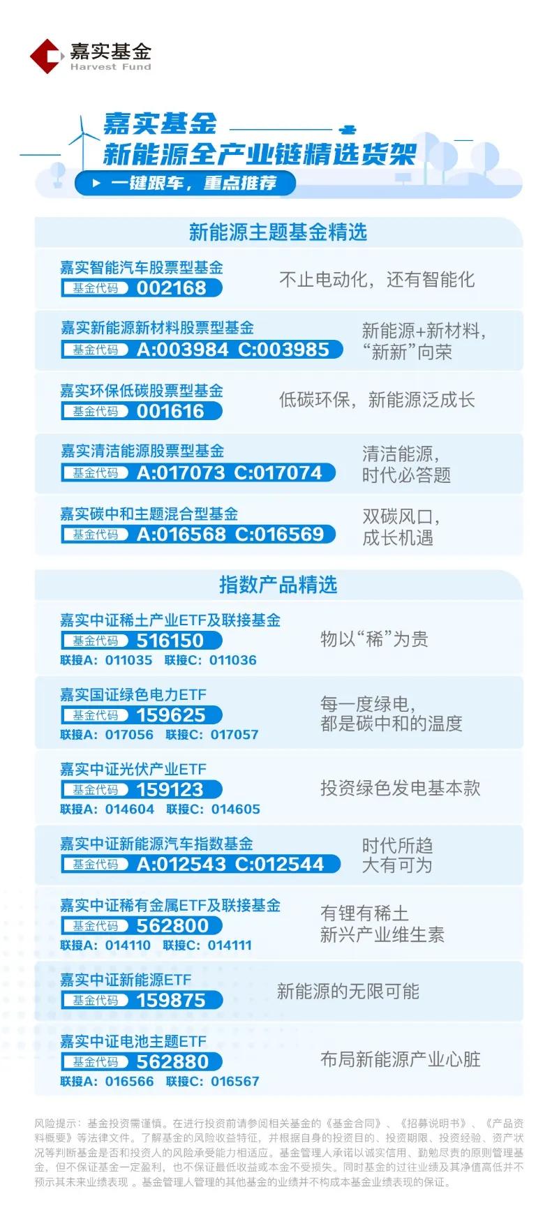 被動指數(shù)產(chǎn)品方面,在新能源新材料方向,嘉實基金體系化布局了包括上游材料端的稀土ETF嘉實(516150)及聯(lián)接、稀有金屬ETF(562800)及聯(lián)接;發(fā)電端的光伏ETF嘉實(159123)及聯(lián)接、綠色電力ETF(159625)及聯(lián)接;儲能及用電端的電池ETF嘉實(562880)及聯(lián)接、嘉實中證新能源汽車指數(shù)(012543),以及跟蹤新能源產(chǎn)業(yè)整體表現(xiàn)的新能源ETF(159875)等等,全面覆蓋新能源行業(yè)的各領(lǐng)域。